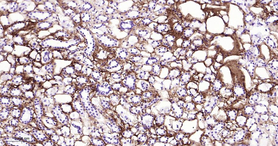 Paraformaldehyde-fixed, paraffin embedded Human Kidney; Antigen retrieval by boiling in sodium citrate buffer (pH6.0) for 15 min; The section was incubated with Collagen I Polyclonal Antibody, Unconjugated (bs-10423R) at 1:800 overnight at 4°C, followed by conjugation to the bs-0295G-HRP and DAB (C-0010) staining.