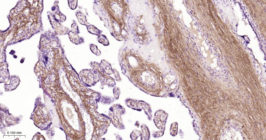 Paraformaldehyde-fixed, paraffin embedded Human Placenta; Antigen retrieval by boiling in sodium citrate buffer (pH6.0) for 15 min; The section was incubated with Collagen I Polyclonal Antibody, Unconjugated (bs-10423R) at 1:800 overnight at 4°C, followed by conjugation to the bs-0295G-HRP and DAB (C-0010) staining.