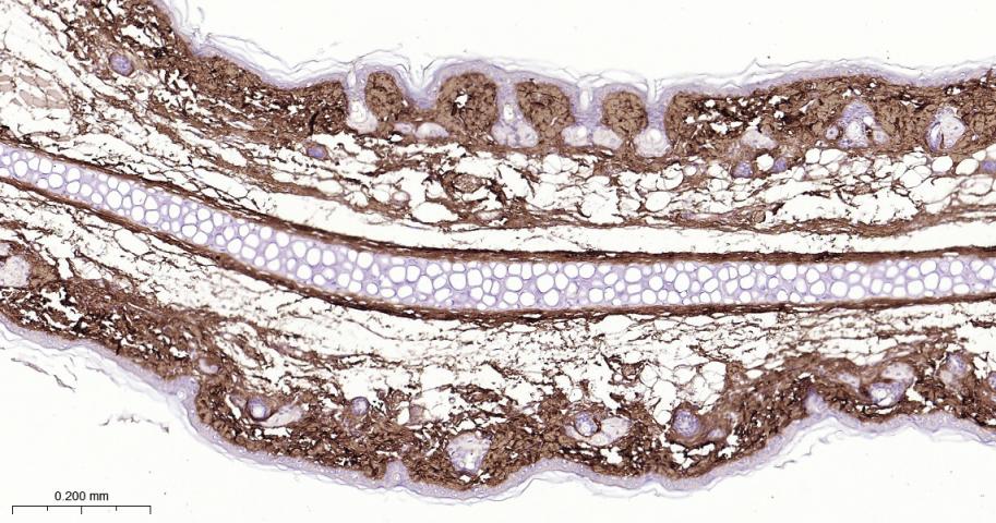 Paraformaldehyde-fixed, paraffin embedded Rat Skin; Antigen retrieval by boiling in sodium citrate buffer (pH6.0) for 15 min; The section was incubated with Collagen I Polyclonal Antibody, Unconjugated (bs-10423R) at 1:800 overnight at 4°C, followed by conjugation to the bs-0295G-HRP and DAB (C-0010) staining.
