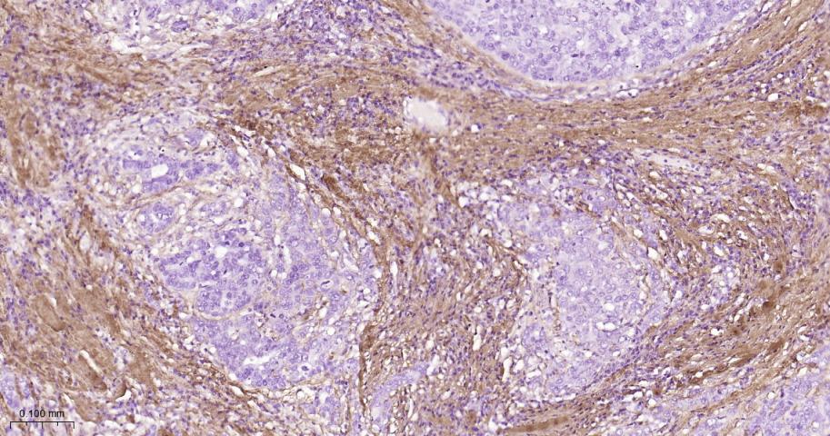 Paraformaldehyde-fixed, paraffin embedded Human Esophagus Cancer; Antigen retrieval by boiling in sodium citrate buffer (pH6.0) for 15 min; The section was incubated with Collagen I Polyclonal Antibody, Unconjugated (bs-10423R) at 1:800 overnight at 4°C, followed by conjugation to the bs-0295G-HRP and DAB (C-0010) staining.