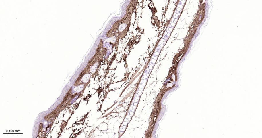 Paraformaldehyde-fixed, paraffin embedded Mouse Skin; Antigen retrieval by boiling in sodium citrate buffer (pH6.0) for 15 min; The section was incubated with Collagen I Polyclonal Antibody, Unconjugated (bs-10423R) at 1:800 overnight at 4°C, followed by conjugation to the bs-0295G-HRP and DAB (C-0010) staining.