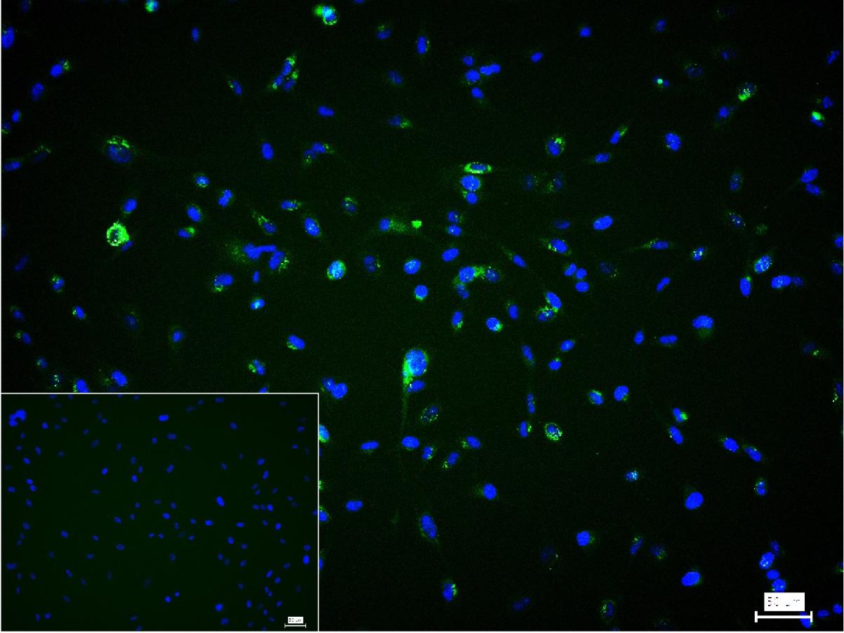 4% Paraformaldehyde-fixed U-87MG (H) cell; Triton X-100 at r.t. for 20 min; Antibody incubation with (Collagen I) polyclonal Antibody, unconjugated (bs-10423R) 1:100, 90 min at 37°C; followed by conjugated Goat Anti-Rabbit IgG antibody (green, bs-60295G-BF488) at 37°C for 90 min, DAPI (blue, C02-04002) was used to stain the cell nuclei. PBS instead of the primary antibody was used as the blank control.