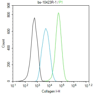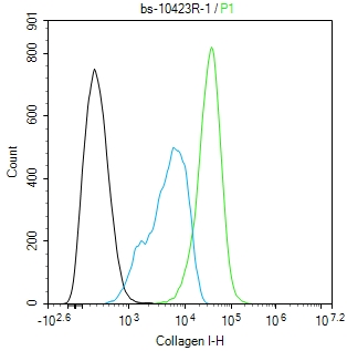 The U2-OS (H) cells were fixed with 4% PFA (10 min at r.t.) and then permeabilized with 90% ice-cold methanol for 20 min at -20℃,the cells then were incubated in 5%BSA to block non-specific protein-protein interactions (30 min at r.t.).Primary Antibody (green):Rabbit Anti-Collagen I antibody (bs-10423R,1:100); Secondary Antibody (white blue): Goat anti-Rabbit IgG-BF488 (bs-60295G-BF488): 1 μg/test. Blank control (black): PBS. Acquisition of 20,000 events was performed.