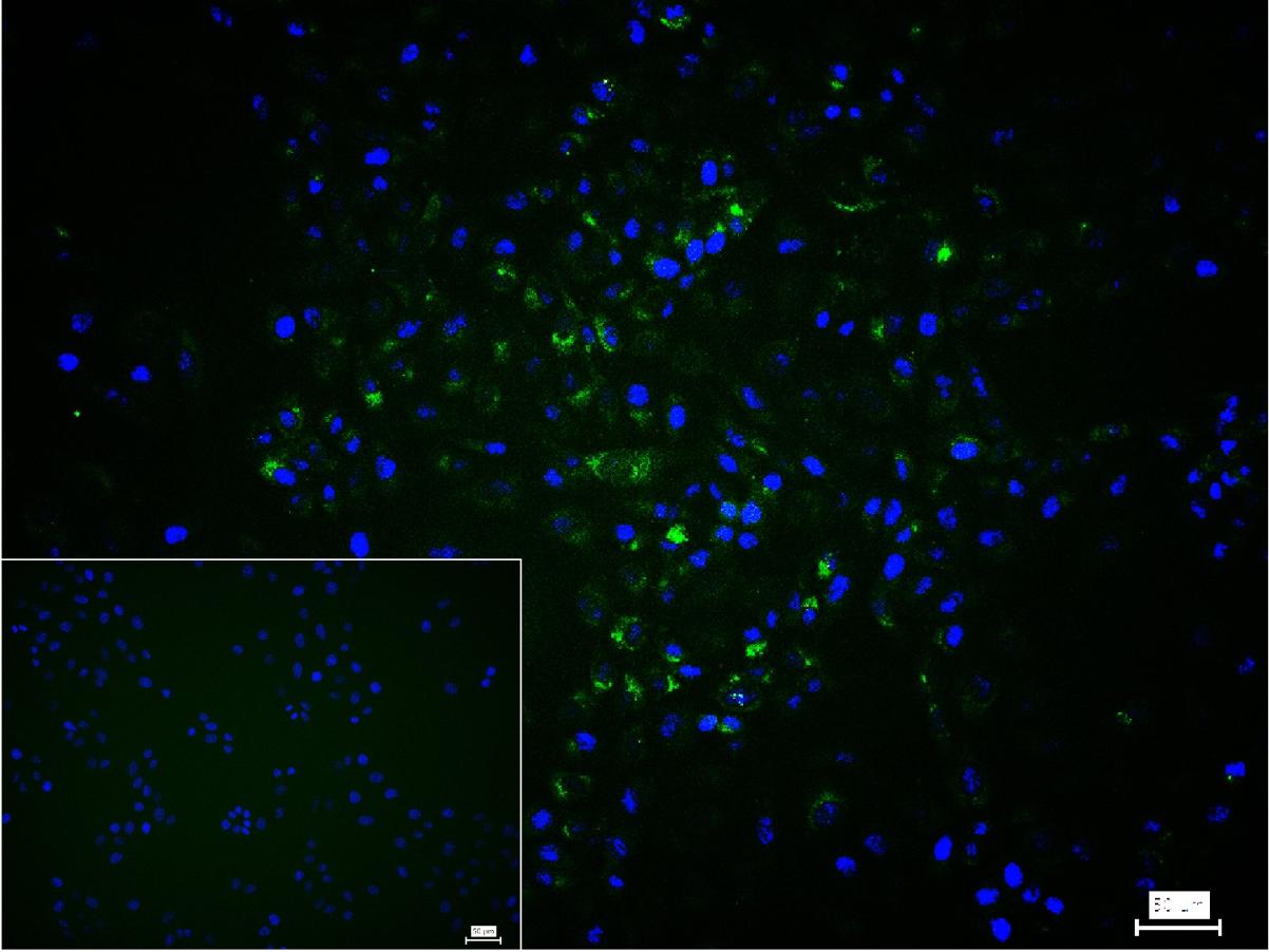 4% Paraformaldehyde-fixed U2-OS (H) cell; Triton X-100 at r.t. for 20 min; Antibody incubation with (Collagen I) polyclonal Antibody, unconjugated (bs-10423R) 1:100, 90 min at 37°C; followed by conjugated Goat Anti-Rabbit IgG antibody (green, bs-60295G-BF488) at 37°C for 90 min, DAPI (blue, C02-04002) was used to stain the cell nuclei. PBS instead of the primary antibody was used as the blank control.