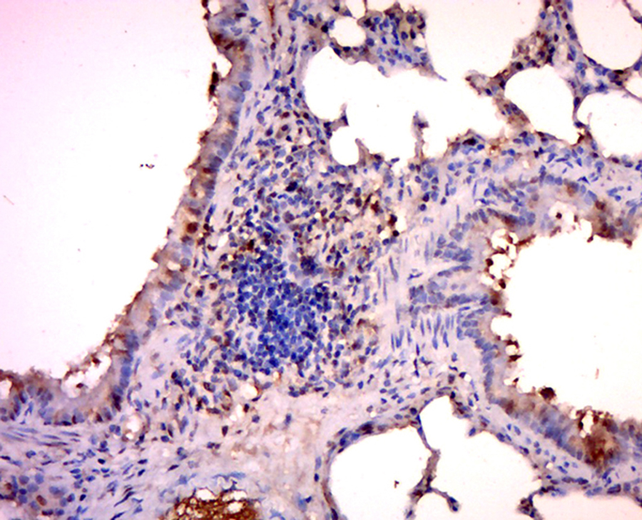 Paraformaldehyde-fixed, paraffin embedded (rat lung); Antigen retrieval by boiling in sodium citrate buffer (pH6.0) for 15min; Block endogenous peroxidase by 3% hydrogen peroxide for 20 minutes; Blocking buffer (normal goat serum) at 37°C for 30min; Antibody incubation with (Retinoid X receptor alpha) Polyclonal Antibody, Unconjugated (bs-20769R) at 1:500 overnight at 4°C, followed by a conjugated secondary (sp-0023) for 20 minutes and DAB staining.