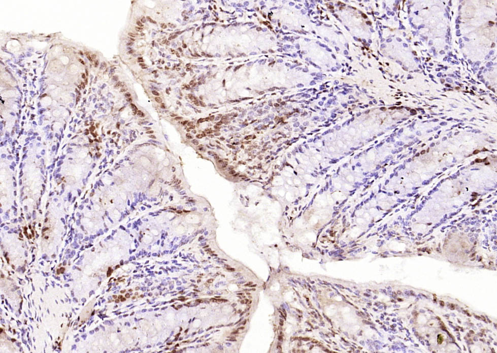 Paraformaldehyde-fixed, paraffin embedded (mouse colon tissue); Antigen retrieval by boiling in sodium citrate buffer (pH6.0) for 15min; Block endogenous peroxidase by 3% hydrogen peroxide for 20 minutes; Blocking buffer (normal goat serum) at 37°C for 30min; Antibody incubation with (NFKB p65 (Ser311)) Polyclonal Antibody, Unconjugated (bs-23303R) at 1:400 overnight at 4°C, followed by operating according to SP Kit(Rabbit) (sp-0023) instructionsand DAB staining.