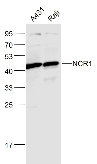 Sample: A431 (Human) Cell Lysate at 30 ug Raji (Human) Cell Lysate at 30 ug Primary: Anti- NCR1 (bs-23550R) at 1/500 dilution Secondary: IRDye800CW Goat Anti-Rabbit IgG at 1/20000 dilution Predicted band size: 31 kD Observed band size: 46 kD
