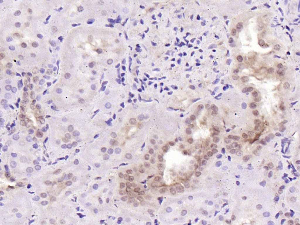 Paraformaldehyde-fixed, paraffin embedded (rat kidney); Antigen retrieval by boiling in sodium citrate buffer (pH6.0) for 15min; Block endogenous peroxidase by 3% hydrogen peroxide for 20 minutes; Blocking buffer (normal goat serum) at 37°C for 30min; Antibody incubation with (TBX3) Polyclonal Antibody, Unconjugated (bs-22586R) at 1:200 overnight at 4°C, followed by operating according to SP Kit(Rabbit) (sp-0023) instructionsand DAB staining.