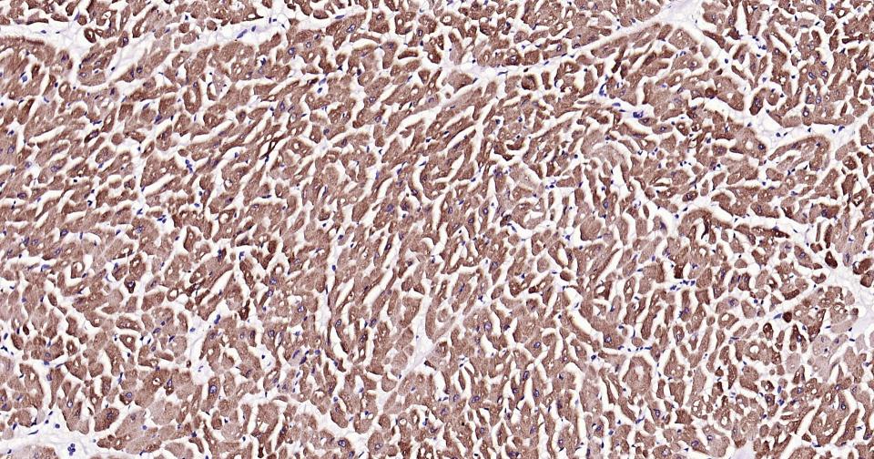 Paraformaldehyde-fixed, paraffin embedded Human Heart; Antigen retrieval by boiling in sodium citrate buffer (pH6.0) for 15 min; Antibody incubation with JNK1 Monoclonal Antibody, Unconjugated(bsm-61084R) at 1:200 overnight at 4°C, followed by conjugation to the bs-0295G-HRP and DAB (C-0010) staining.