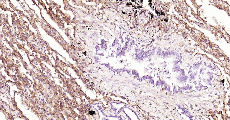 Paraformaldehyde-fixed, paraffin embedded Human Lung Cancer; Antigen retrieval by boiling in sodium citrate buffer (pH6.0) for 15 min; Antibody incubation with ICAM1 Monoclonal Antibody, Unconjugated(bsm-52466R) at 1:200 overnight at 4°C, followed by conjugation to the SP Kit(Rabbit, SP-0023) and DAB (C-0010) staining.