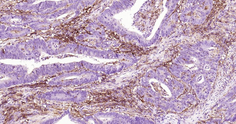 Paraformaldehyde-fixed, paraffin embedded Human Colon Cancer; Antigen retrieval by boiling in sodium citrate buffer (pH6.0) for 15 min; Antibody incubation with ICAM1 Monoclonal Antibody, Unconjugated(bsm-52466R) at 1:200 overnight at 4°C, followed by conjugation to the SP Kit(Rabbit, SP-0023) and DAB (C-0010) staining.