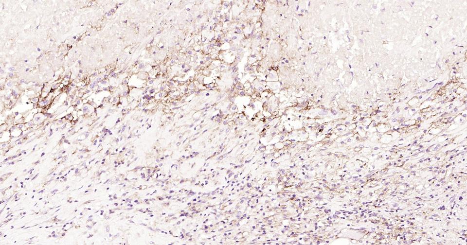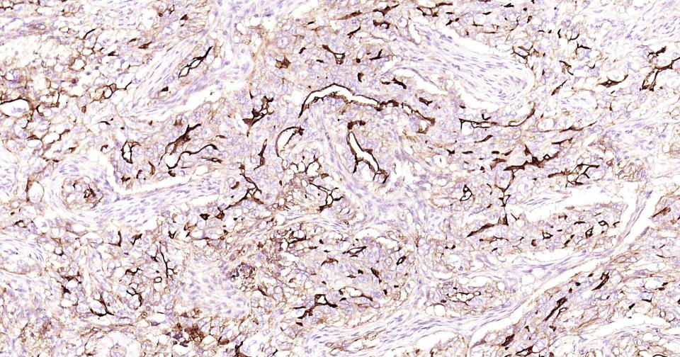 Paraformaldehyde-fixed, paraffin embedded Human Endometrial Cancer; Antigen retrieval by boiling in sodium citrate buffer (pH6.0) for 15 min; Antibody incubation with ICAM1 Monoclonal Antibody, Unconjugated(bsm-52466R) at 1:200 overnight at 4°C, followed by conjugation to the SP Kit(Rabbit, SP-0023) and DAB (C-0010) staining.