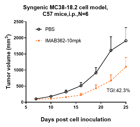 Zolbetuximab inhibited the tumor growth of CLDN18.2-MC38 (Mouse colorectal cancer cells) on C57BL/6N mice. The result showed significant anti-tumor effects, with an tumor inhibition rate (TGI) of 42.3% at 10 mpk at D25.
