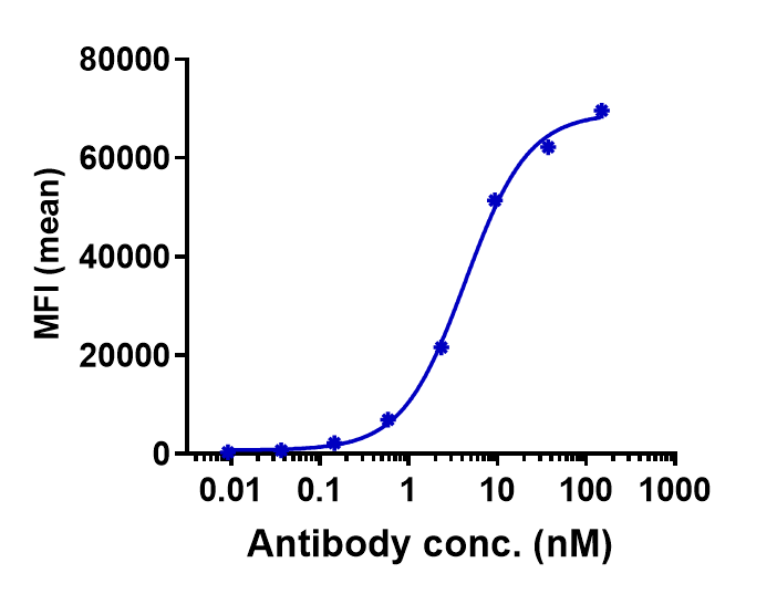 Human CLDN6 CHO cells were stained with Anti-CLDN6 Reference Antibody (IMAB027) and negative control protein respectively, washed and then followed by PE and analyzed with FACS, EC50=4.342 nM.