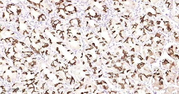 Immunohistochemical analysis of paraffin embedded human stomach tissue slide using IHC0463 (AGR2 IHC Kit).