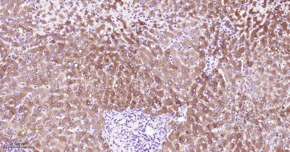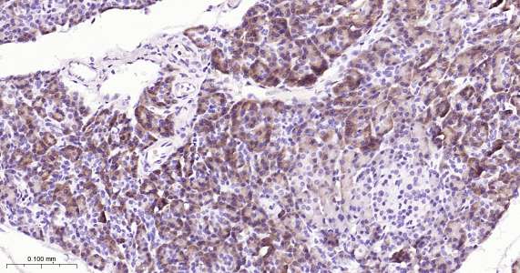 Immunohistochemical analysis of paraffin embedded human pancreas tissue slide using IHC0497H (Human CBS IHC Kit).
