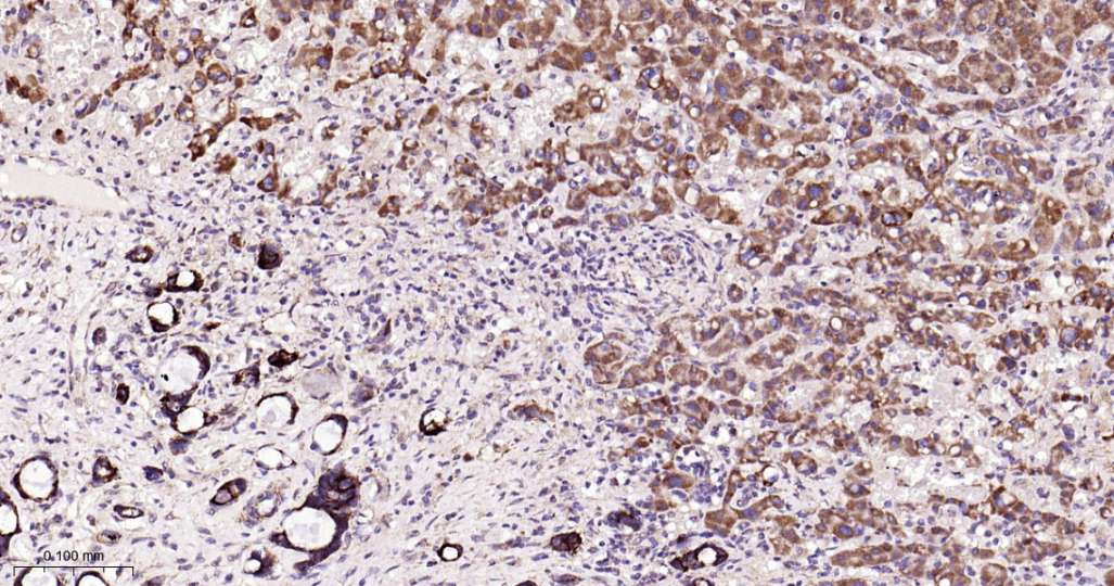 Immunohistochemical analysis of paraffin embedded Human hepatocellular carcinoma tissue slide using IHC0508 (GCLM Kit).