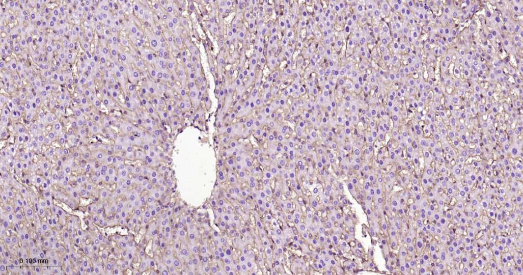 Immunohistochemical analysis of paraffin embedded Mouse skin tissue slide using IHC0521 (Integrin beta 1 Kit).