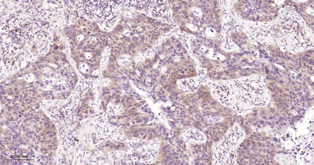 Immunohistochemical analysis of paraffin embedded Human colon cancer tissue slide using IHC0571H (Human Trefoil factor 1 Kit).