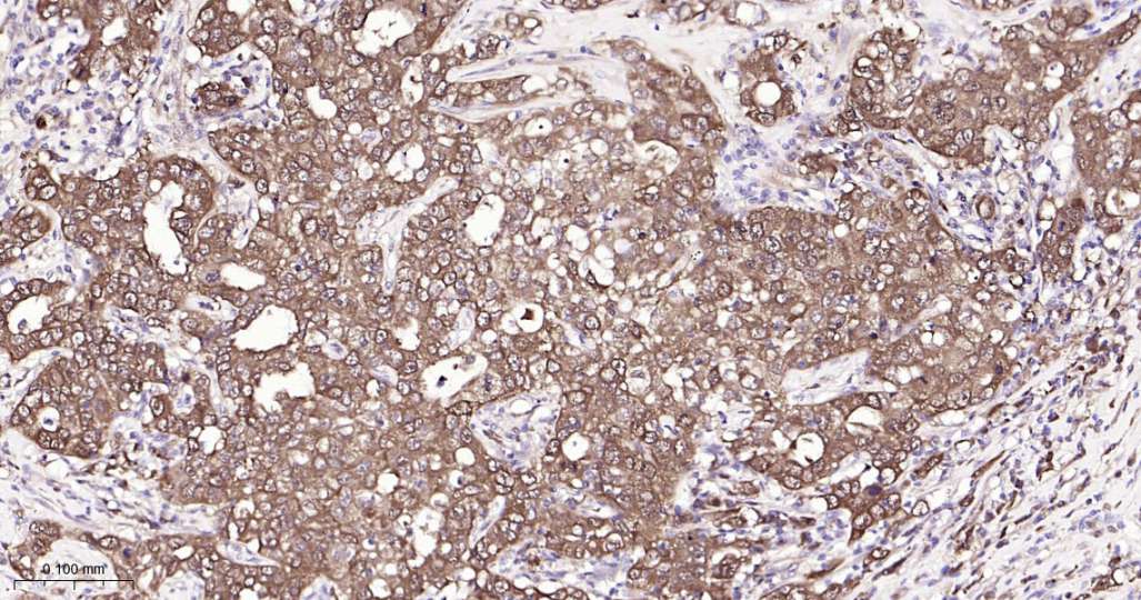 Immunohistochemical analysis of paraffin embedded Human breast cancer tissue slide using IHC0578H (Human NME1/NM23A Kit).