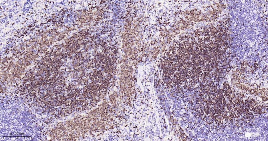 Immunohistochemical analysis of paraffin embedded Mouse spleen tissue slide using IHC0582 (PAX5 Kit).
