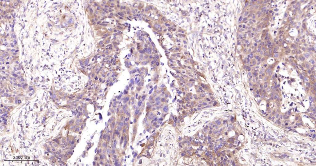 Immunohistochemical analysis of paraffin embedded Human lung cancer tissue slide using IHC0590 (PGAM1 Kit).
