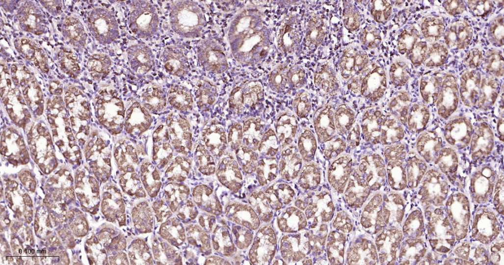 Immunohistochemical analysis of paraffin embedded Human stomach tissue slide using IHC0625H (Human ACADM Kit).