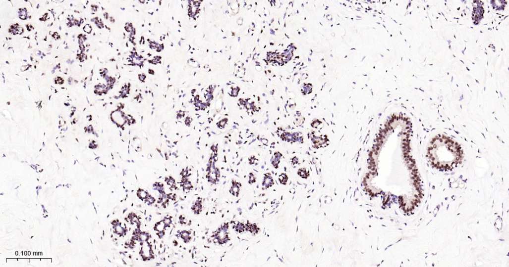 Immunohistochemical analysis of paraffin embedded Human mammary gland tissue slide using IHC0628H (Human FTO Kit).