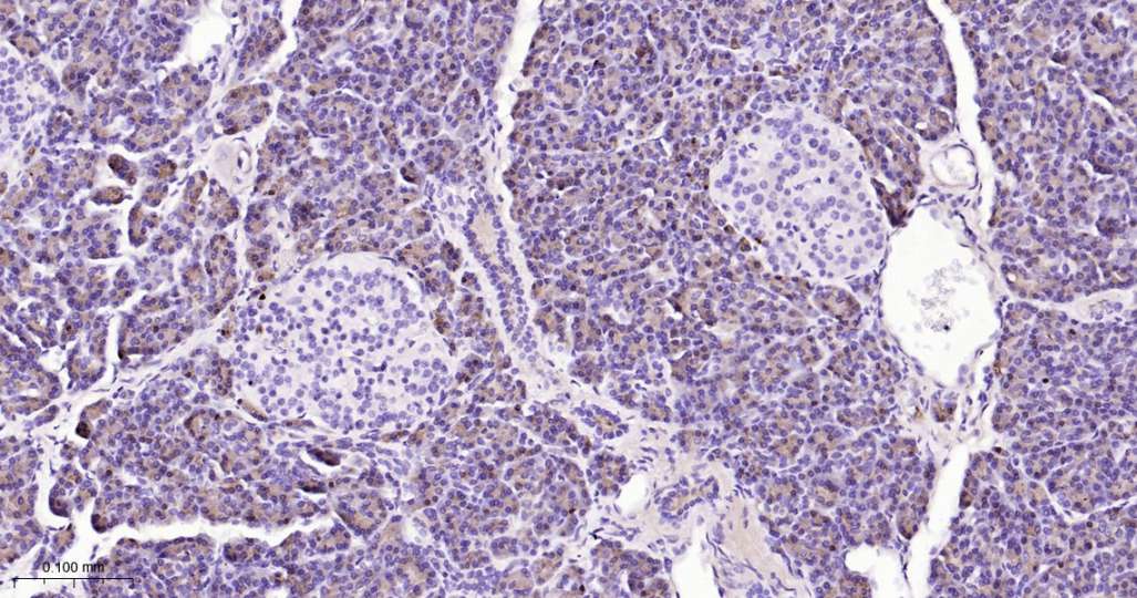 Immunohistochemical analysis of paraffin embedded Human pancreas tissue slide using IHC0633H (Human SPINK1 Kit).