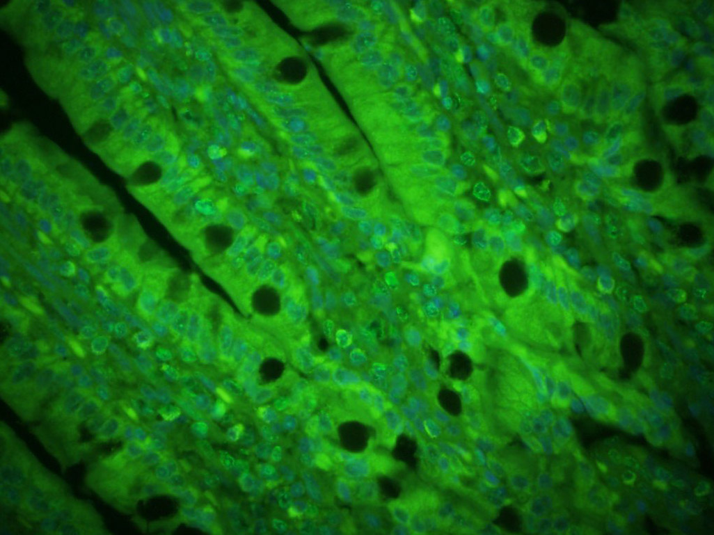 Paraformaldehyde-fixed, paraffin embedded (Rat small intestine); Antigen retrieval by boiling in sodium citrate buffer (pH6.0) for 15min; Block endogenous peroxidase by 3% hydrogen peroxide for 20 minutes; Blocking buffer (normal goat serum) at 37°C for 30min; Incubation: Anti-IL-5 Antibody, conjugated (bs-1318R-BF488) 1:400, 1.5 hours at 37°C; DAPI (5ug/ml, blue, C-0033) was used to stain the cell nuclei.