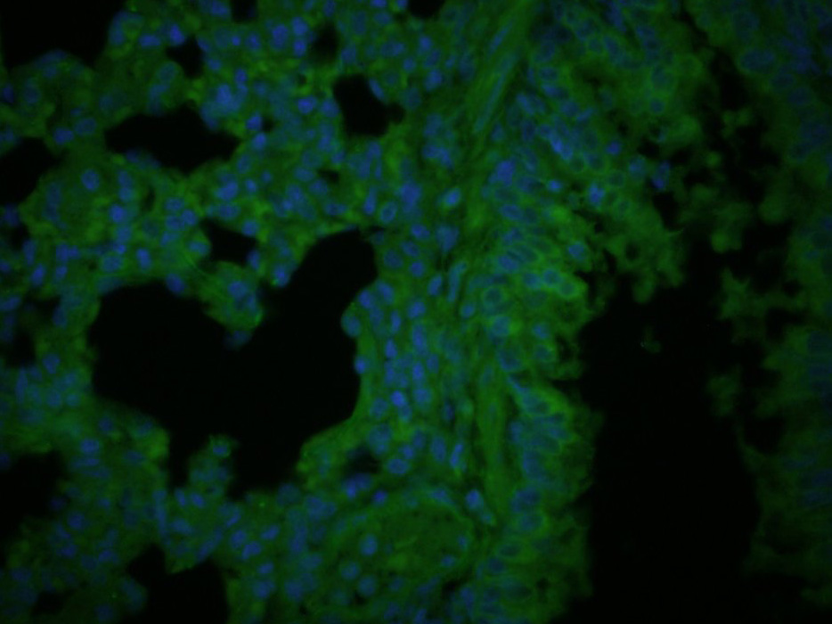 Paraformaldehyde-fixed, paraffin embedded (Mouse lung); Antigen retrieval by boiling in sodium citrate buffer (pH6.0) for 15min; Block endogenous peroxidase by 3% hydrogen peroxide for 20 minutes; Blocking buffer (normal goat serum) at 37°C for 30min; Incubation: Anti-Collagen II Antibody, conjugated (bs-10589R-BF488) 1:400, 1.5 hours at 37°C; DAPI (5ug/ml, blue, C-0033) was used to stain the cell nuclei.