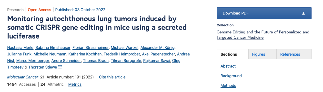 To facilitate a more widespread use, we have generated a reporter mouse that expresses a Cre-inducible luciferase from Gaussia princeps (GLuc), which is secreted by cells in an energy-consuming process and can be measured quantitatively in the blood as a marker for the viable tumor load...