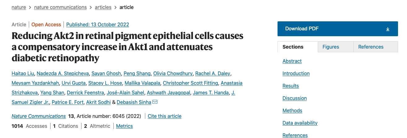 摘要:The retinal pigment epithelium (RPE) plays an important role in the development of diabetic retinopathy (DR), a leading cause of blindness worldwide. Here we set out to explore the role of Akt2 signaling—integral to both RPE homeostasis and glucose metabolism—to DR. Using human tissue and genetically manipulated mice (including RPE-specific conditional knockout (cKO) and knock-in (KI) mice), we investigate whether Akts in the RPE influences DR in models of diabetic eye disease. We found that Akt1 and Akt2 activities were reciprocally regulated in the RPE of DR donor tissue and diabetic mice. Akt2 cKO attenuated diabetes-induced retinal abnormalities through a compensatory upregulation of phospho-Akt1 leading to an inhibition of vascular injury, inflammatory cytokine release, and infiltration of immune cells mediated by the GSK3β/NF-κB signaling pathway; overexpression of Akt2 has no effect. We propose that targeting Akt1 activity in the RPE may be a novel therapy for treating DR.