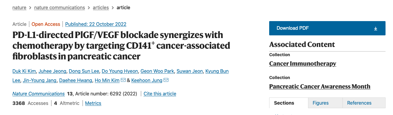 摘要:Pancreatic ductal adenocarcinoma (PDAC) has a poor 5-year overall survival rate. Patients with PDAC display limited benefits after undergoing chemotherapy or immunotherapy modalities. Herein, we reveal that chemotherapy upregulates placental growth factor (PlGF), which directly activates cancer-associated fibroblasts (CAFs) to induce fibrosis-associated collagen deposition in PDAC. Patients with poor prognosis have high PIGF/VEGF expression and an increased number of PIGF/VEGF receptor-expressing CAFs, associated with enhanced collagen deposition. We also develop a multi-paratopic VEGF decoy receptor (Ate-Grab) by fusing the single-chain Fv of atezolizumab (anti-PD-L1) to VEGF-Grab to target PD-L1-expressing CAFs. Ate-Grab exerts anti-tumor and anti-fibrotic effects in PDAC models via the PD-L1-directed PlGF/VEGF blockade. Furthermore, Ate-Grab synergizes with gemcitabine by relieving desmoplasia. Single-cell RNA sequencing identifies that a CD141+ CAF population is reduced upon Ate-Grab and gemcitabine combination treatment. Overall, our results elucidate the mechanism underlying chemotherapy-induced fibrosis in PDAC and highlight a combinatorial therapeutic strategy for desmoplastic cancers.