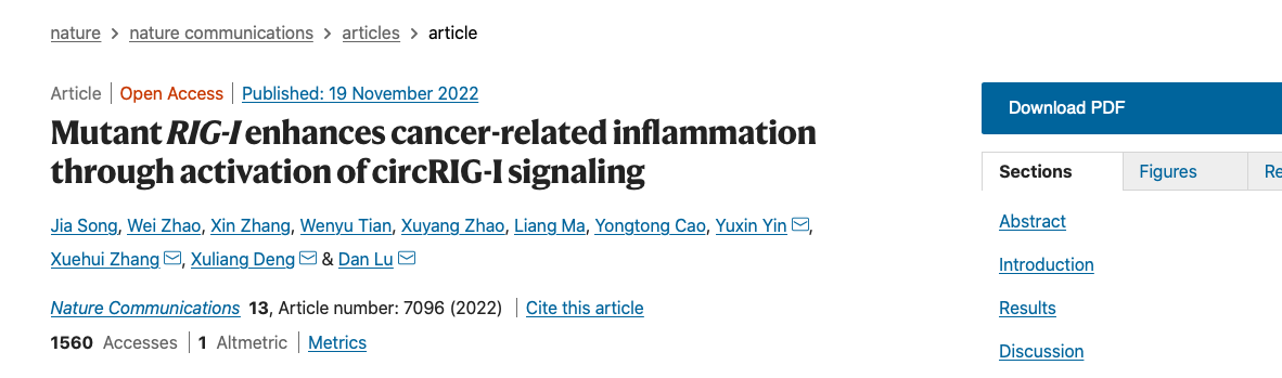摘要:RIG-I/DDX58 plays a key role in host innate immunity. However, its therapeutic potential for inflammation-related cancers remains to be explored. Here we identify frameshift germline mutations of RIG-I occurring in patients with colon cancer. Accordingly, Rig-ifs/fs mice bearing a frameshift mutant Rig-i exhibit increased susceptibility to colitis-related colon cancer as well as enhanced inflammatory response to chemical, virus or bacteria. In addition to interruption of Rig-i mRNA translation, the Rig-i mutation changes the secondary structure of Rig-i pre-mRNA and impairs its association with DHX9, consequently inducing a circular RNA generation from Rig-i transcript, thereby, designated as circRIG-I. CircRIG-I is frequently upregulated in colon cancers and its upregulation predicts poor outcome of colon cancer. Mechanistically, circRIG-I interacts with DDX3X, which in turn stimulates MAVS/TRAF5/TBK1 signaling cascade, eventually activating IRF3-mediated type I IFN transcription and aggravating inflammatory damage. Reciprocally, all-trans retinoic acid acts as a DHX9 agonist, ameliorates immunopathology through suppression of circRIG-I biogenesis. Collectively, our results provide insight into mutant RIG-I action and propose a potential strategy for the treatment of colon cancer.