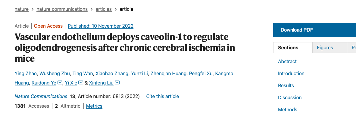作者單位:南京大學(xué)醫(yī)學(xué)院附屬金陵醫(yī)院神經(jīng)內(nèi)科摘要:Oligovascular coupling contributes to white matter vascular homeostasis. However, little is known about the effects of oligovascular interaction on oligodendrocyte precursor cell (OPC) changes in chronic cerebral ischemia. Here, using a mouse of bilateral carotid artery stenosis, we show a gradual accumulation of OPCs on vasculature with impaired oligodendrogenesis. Mechanistically, chronic ischemia induces a substantial loss of endothelial caveolin-1 (Cav-1), leading to vascular secretion of heat shock protein 90α (HSP90α). Endothelial-specific over-expression of Cav-1 or genetic knockdown of vascular HSP90α restores normal vascular-OPC interaction, promotes oligodendrogenesis and attenuates ischemic myelin damage. miR-3074(?1)?3p is identified as a direct inducer of Cav-1 reduction in mice and humans. Endothelial uptake of nanoparticle-antagomir improves myelin damage and cognitive deficits dependent on Cav-1. In summary, our findings demonstrate that vascular abnormality may compromise oligodendrogenesis and myelin regeneration through endothelial Cav-1, which may provide an intercellular mechanism in ischemic demyelination.