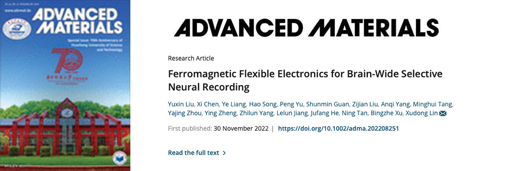 摘要:Flexible microelectronics capable of straightforward implantation, remotely controlled navigation, and stable long-term recording hold great promise in diverse medical applications, particularly in deciphering complex functions of neural circuits in the brain. Existing flexible electronics, however, are often limited in bending and buckling during implantation, and unable to access a large brain region. Here, an injectable class of electronics with stable recording, omnidirectional steering, and precise navigating capabilities based on magnetic actuation is presented. After simple transcriptional injection, the rigid coatings are biodegraded quickly and the bundles of magnetic-nanoparticles-coated microelectrodes become separated, ultra-flexible, and magnetic actuated for further minimally invasive three-dimensional interpenetration in the brain. As proof of concept, this paradigm-shifting approach is demonstrated for selective and multiplexed neural activities recording across distant regions in the deep rodent brains. Coupling with optogenetic neural stimulation, the unique capabilities of this platform in electrophysiological readouts of projection dynamics in vivo are also demonstrated. The ability of these miniaturized, remotely controllable, and biocompatible ferromagnetic flexible electronics to afford minimally invasive manipulations in the soft tissues of the mammalian brain foreshadows applications in other organ systems, with great potential for broad utility in biomedical science and engineering.