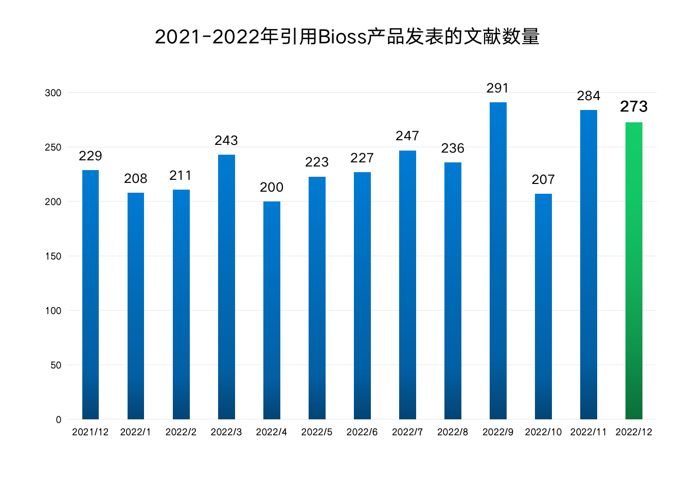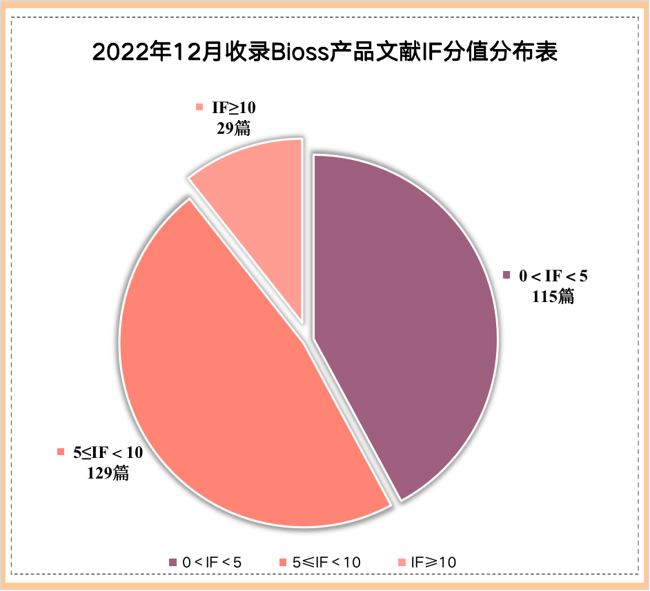 近期收錄2022年12月引用Bioss產(chǎn)品發(fā)表的文獻(xiàn)共273篇(圖一,綠色柱),文章影響因子(IF) 總和高達(dá)1724.643,其中,10分以上文獻(xiàn)29篇(圖二)。