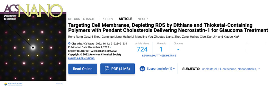 摘要:Glaucoma is the leading cause of irreversible blindness worldwide, characterized by progressive vision loss due to the selective damage to retinal ganglion cells (RGCs) and their axons. Oxidative stress is generally believed as one key factor of RGCs death. Recently, necroptosis was identified to play a key role in glaucomatous injury. Therefore, depletion of reactive oxygen species (ROS) and inhibition of necroptosis in RGCs has become one of treatment strategies for glaucoma. However, existing drugs without efficient drug enter into the retina and have controlled release due to a short drug retention. Herein, we designed a glaucomatous microenvironment-responsive drug carrier polymer, which is characterized by the presence of thioketal bonds and 1,4-dithiane unit in the main chain for depleting ROS as well as the pendant cholesterols for targeting cell membranes. This polymer was adopted to encapsulate an inhibitor of necroptosis, necrostatin-1, into nanoparticles (designated as NP1). NP1 with superior biosafety could scavenge ROS in RGCs both in vitro and in vivo of an acute pathological glaucomatous injury model. Further, NP1 was found to effectively inhibit the upregulation of the necroptosis pathway, reducing the death of RGCs. The findings in this study exemplified the use of nanomaterials as potential strategies to treat glaucoma.