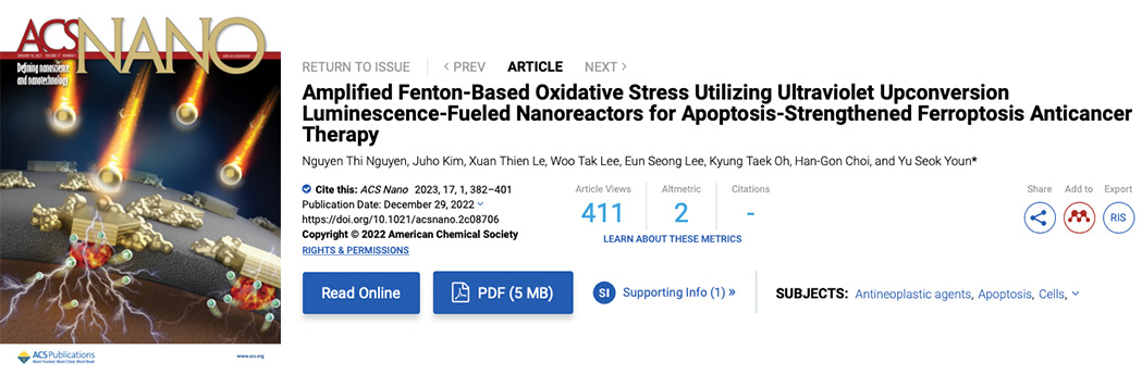 摘要:As an emerging anticancer strategy, ferroptosis has recently been developed in combination with current therapeutic modalities to overcome the existing limitations of conventional therapies. Herein, an ultraviolet (UV) upconversion luminescence-fueled nanoreactor is explored to combine ferroptosis and apoptosis through the UV-catalyzed Fenton reaction of an iron supplement (ferric ammonium citrate) loaded in a mesoporous silica layer in addition to the support of a chemotherapeutic agent (cisplatin) attached on the functionalized silica surface for the treatment of triple negative breast cancer (TNBC). The nanoplatform can circumvent the low penetration depth typical of UV light by upconverting near-infrared irradiation and emitting UV photons that convert Fe3+ to Fe2+ to boost the generation of hydroxyl radicals (·OH), causing devastating lipid peroxidation. Apart from DNA damage-induced apoptosis, cisplatin can also catalyze Fenton-based therapy by its abundant production of hydrogen peroxide (H2O2). As a bioinspired lipid membrane, the folate receptor-targeted liposome as the coating layer offers high biocompatibility and colloidal stability for the upconversion nanoparticles, in addition to prevention of the premature release of encapsulated hydrophilic compounds, before driving the nanoformulation to the target tumor site. As a result, superior antitumor efficacy has been observed in a 4T1 tumor-bearing mouse model with negligible side effects, suggesting that such a nanoformulation could play a pivotal role in effective apoptosis-strengthened ferroptosis TNBC therapy.