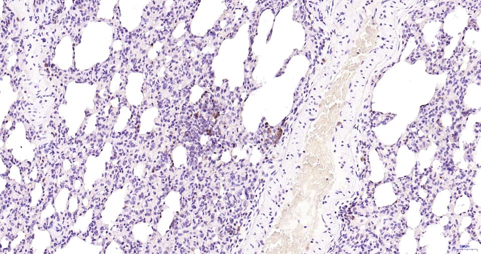 Paraformaldehyde-fixed, paraffin embedded Mouse Lung; Antigen retrieval by boiling in sodium citrate buffer (pH6.0) for 15 min; Antibody incubation with Cleaved-Caspase 3 p17 Monoclonal Antibody, Unconjugated(bsm-61090R) at 1:100 overnight at 4°C, followed by conjugation to the SP Kit (Rabbit, SP-0023) and DAB (C-0010) staining.