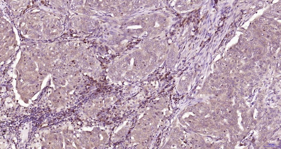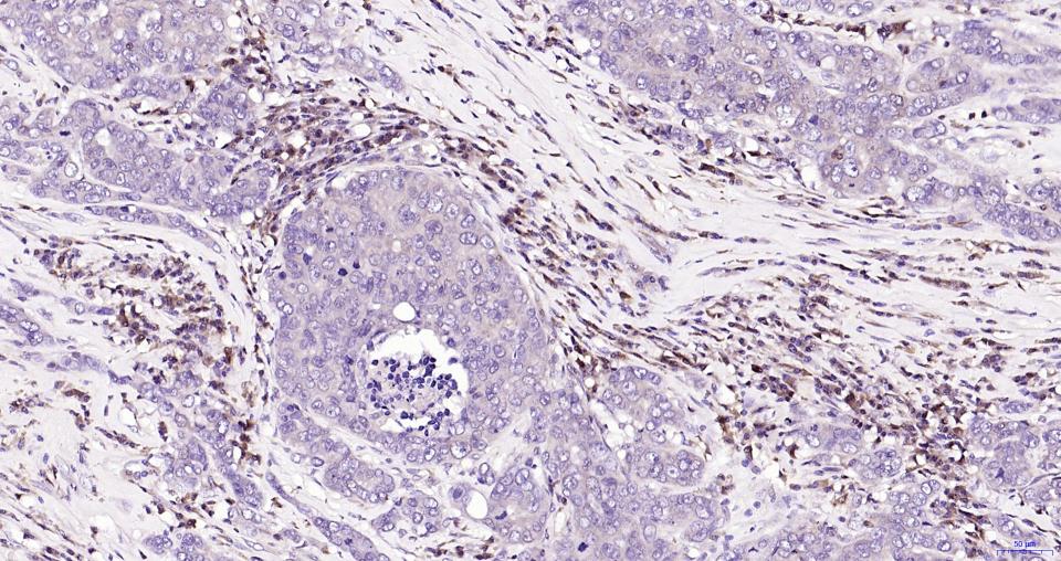 Paraformaldehyde-fixed, paraffin embedded Human Breast Cancer; Antigen retrieval by boiling in sodium citrate buffer (pH6.0) for 15 min; Antibody incubation with Cleaved-Caspase 3 p17 Monoclonal Antibody, Unconjugated(bsm-61090R) at 1:100 overnight at 4°C, followed by conjugation to the SP Kit (Rabbit, SP-0023) and DAB (C-0010) staining.