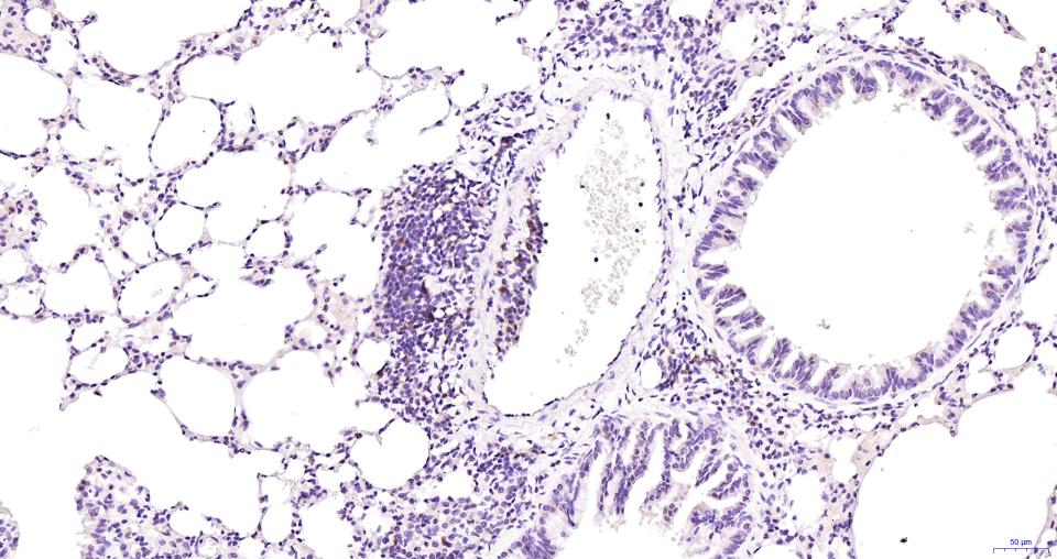 Paraformaldehyde-fixed, paraffin embedded Rat Lung; Antigen retrieval by boiling in sodium citrate buffer (pH6.0) for 15 min; Antibody incubation with Cleaved-Caspase 3 p17 Monoclonal Antibody, Unconjugated(bsm-61090R) at 1:100 overnight at 4°C, followed by conjugation to the SP Kit (Rabbit, SP-0023) and DAB (C-0010) staining.