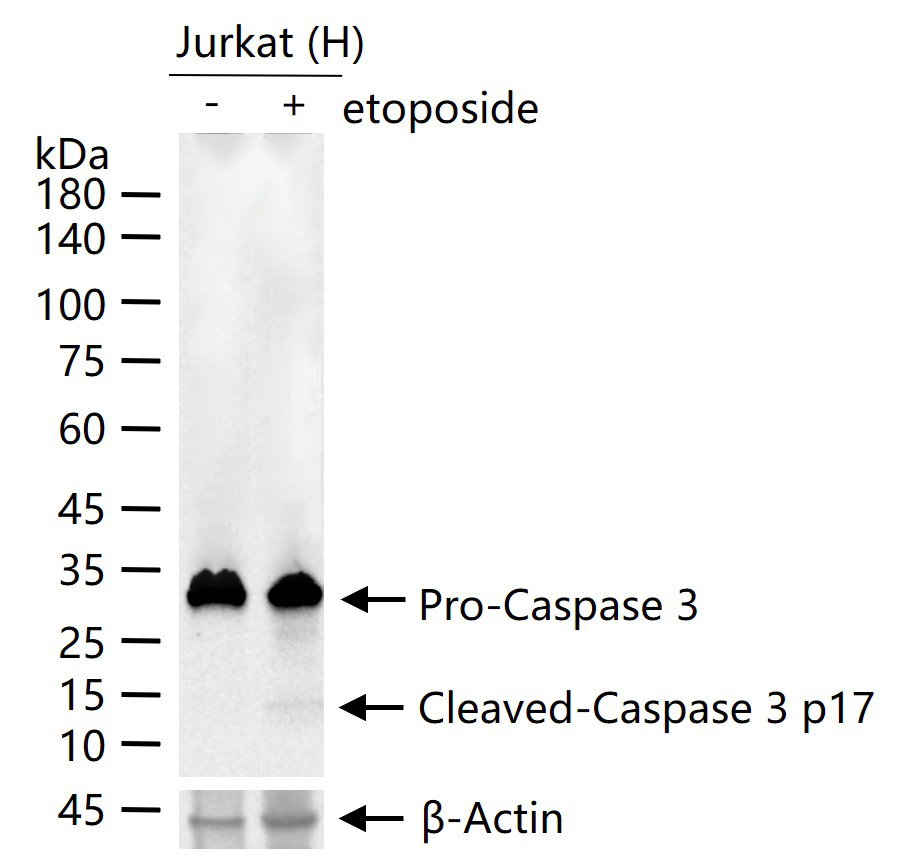 Jurkat (H) cells were treated with or without etoposide treated (25uM) for 5 h, 25 μg total protein per lane of cell lysates (see on figure) probed with Cleaved-Caspase 3 p17 monoclonal antibody, unconjugated (bsm-61090R) at 1:1000 dilution and 4°C overnight incubation. Followed by conjugated secondary antibody incubation at r.t. for 60 min.