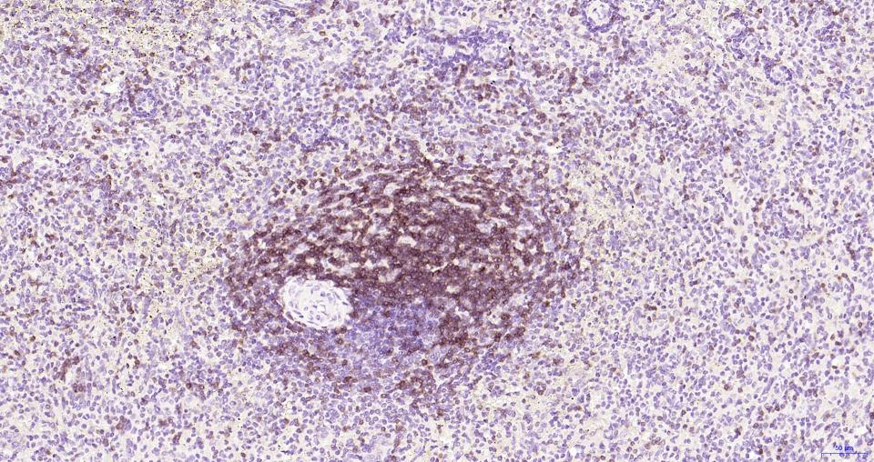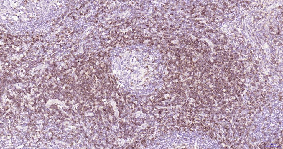Paraformaldehyde-fixed, paraffin embedded Human Spleen; Antigen retrieval by boiling in sodium citrate buffer (pH6.0) for 15 min; Antibody incubation with CD5 Monoclonal Antibody, Unconjugated(bsm-61094R) at 1:200 overnight at 4°C, followed by conjugation to the SP Kit (Rabbit, SP-0023) and DAB (C-0010) staining.
