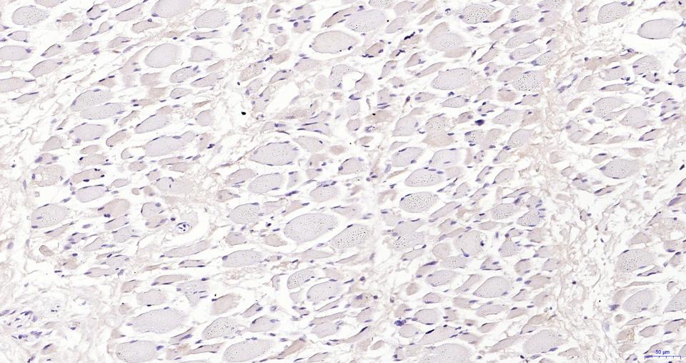 (Negative control)Paraformaldehyde-fixed, paraffin embedded Human Skeletal muscle; Antigen retrieval by boiling in sodium citrate buffer (pH6.0) for 15 min; Antibody incubation with CD5 Monoclonal Antibody, Unconjugated(bsm-61094R) at 1:200 overnight at 4°C, followed by conjugation to the SP Kit (Rabbit, SP-0023) and DAB (C-0010) staining.