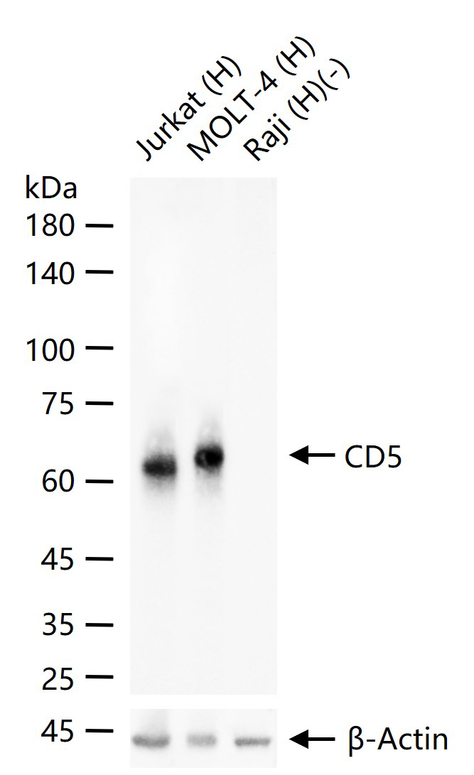 25 ug total protein per lane of various lysates (see on figure) probed with CD5 monoclonal antibody, unconjugated (bsm-61094R) at 1:1000 dilution and 4°C overnight incubation. Followed by conjugated secondary antibody incubation at r.t. for 60 min.