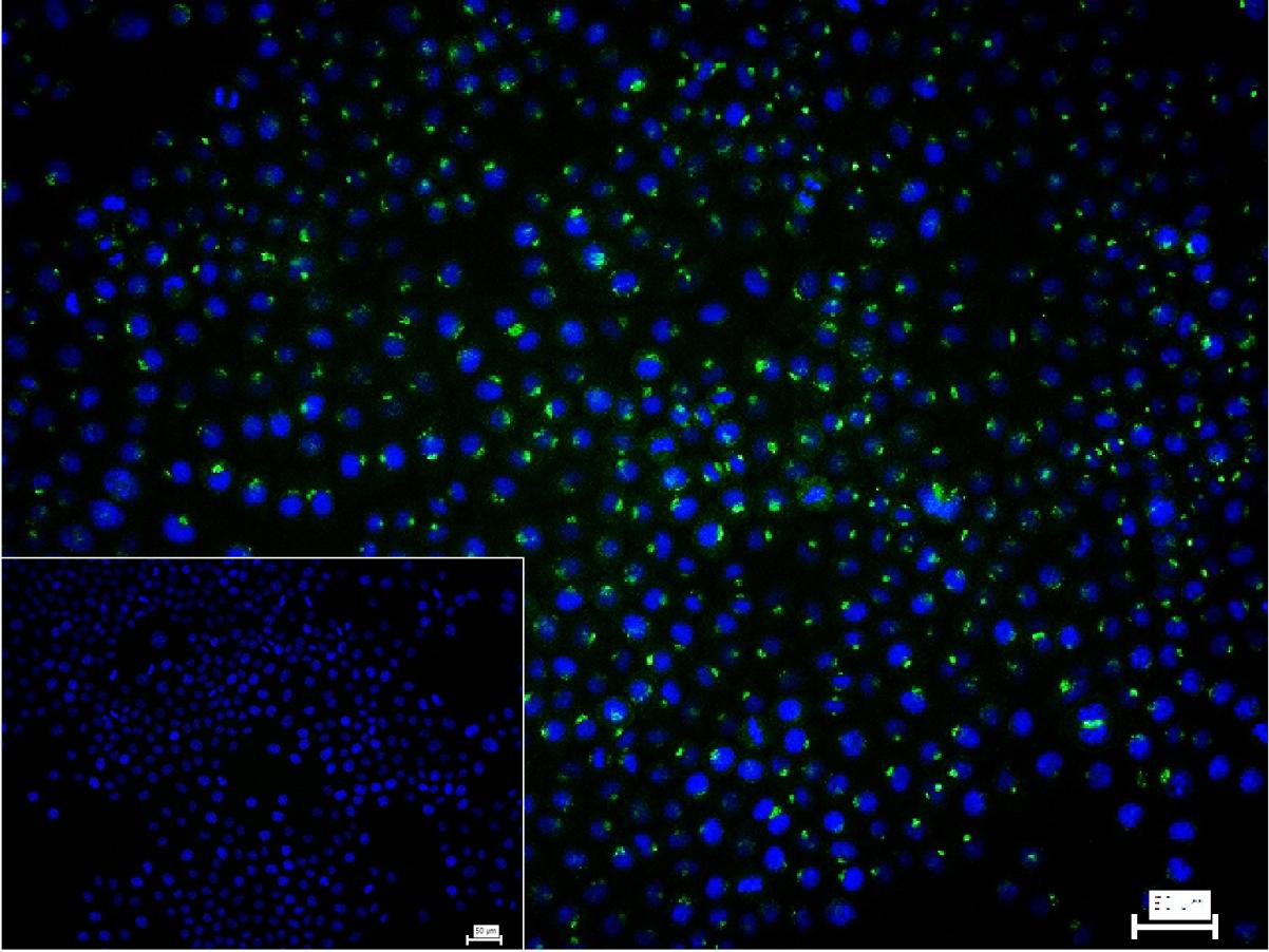 4% Paraformaldehyde-fixed Hela (H) cell; Triton X-100 at r.t. for 20 min; Antibody incubation with (Caveolin-) monoclonal Antibody, unconjugated (bsm-61101R) 1:100, 90 min at 37°C; followed by conjugated Goat Anti-Rabbit IgG antibody (green, bs-60295G-BF488) at 37°C for 90 min, DAPI (blue, C02-04002) was used to stain the cell nuclei. PBS instead of the primary antibody was used as the blank control.