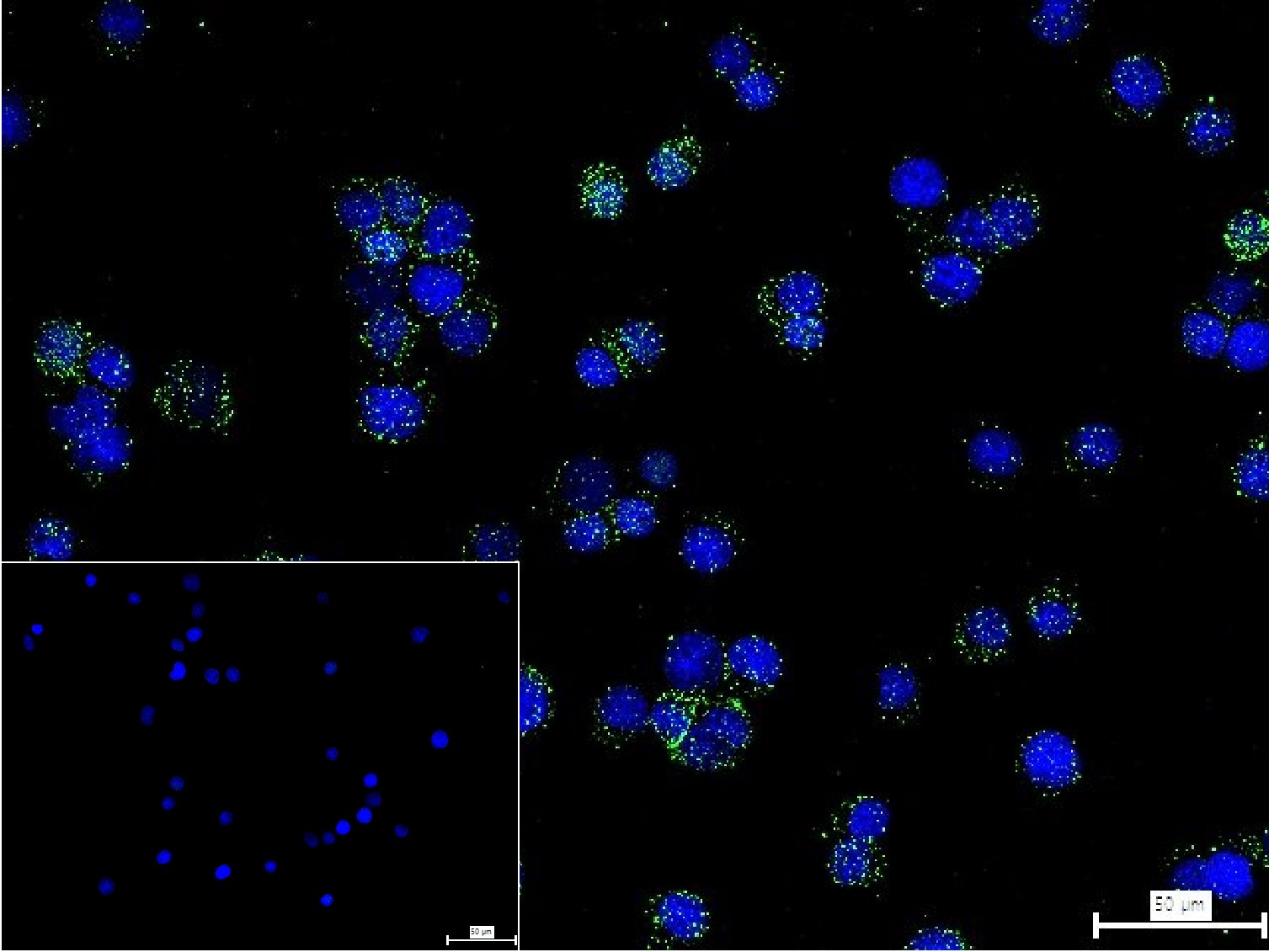 4% Paraformaldehyde-fixed Jurkat (H) cell; Antibody incubation with (CD97) monoclonal Antibody, unconjugated (bsm-61103R) 1:100, 90 min at 37°C; followed by conjugated Goat Anti-Rabbit IgG antibody (green, bs-60295G-BF488) at 37°C for 90 min, DAPI (blue, C02-04002) was used to stain the cell nuclei. PBS instead of the primary antibody was used as the blank control.
