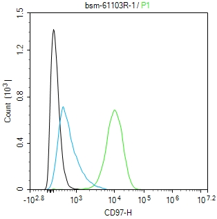 The Jurkat (H) cells were incubated in 5%BSA to block non-specific protein-protein interactions (30 min at r.t.). Primary Antibody (green): Rabbit Anti-CD97 antibody (bsm-61103R,1:100); Secondary Antibody (white blue): Goat anti-Rabbit IgG-BF488(bs-60295G-BF488): 1 μg/test. Blank control (black): PBS. Acquisition of 20,000 events was performed.